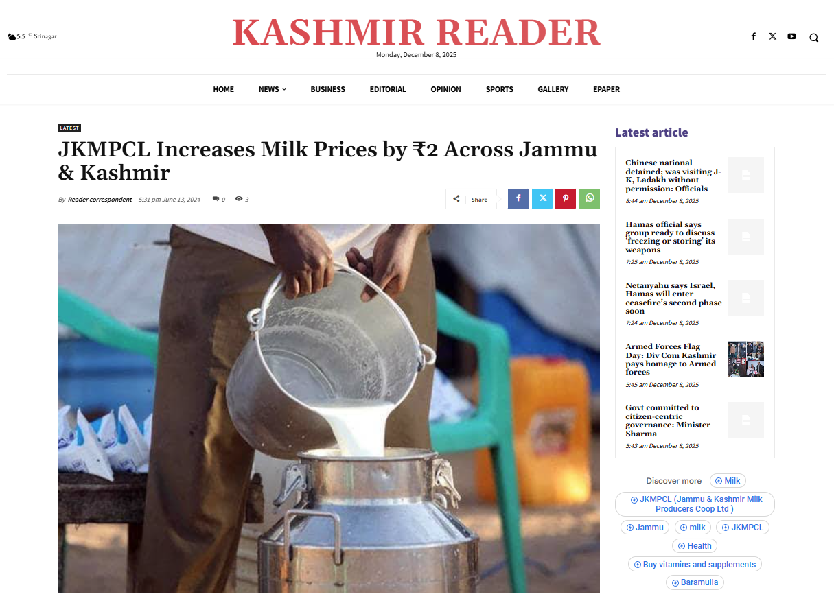 A detailed report by Kashmir Reader explained the rationale behind JKMPCL’s ₹2/litre milk price revision, noting how the adjustment helps balance rising operational costs while safeguarding farmer payments. The publication also highlighted our continued commitment to quality and steady procurement. We appreciate Kashmir Reader for presenting the update clearly.